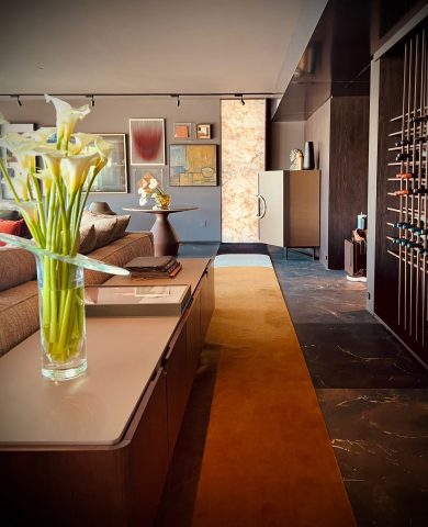 El Espacio 9 está ubicado en la planta baja con vista al lago y fue pensado arquitectónicamente como una caja oscura que proyecta el exterior. Durante el día, el entorno y la naturaleza son los protagonistas a través de la ventana; mientras que en la noche cobra vida el interior, con revestimientos en madera y metal, y un equipamiento de Colección Sur que incluye luminarias, mobiliario y obras de arte que reflejan la vitalidad del diseño latinoamericano actual. Entre las piezas más destacadas se encuentran las luminarias del diseñador argentino Cristian Mohaded, quien colabora actualmente con marcas como Louis Vuitton, Loro Piana, Roche Bobois y Thonnet Viena, y cuyo trabajo forma parte de la colección permanente del Museo de Arte y Diseño de Nueva York.