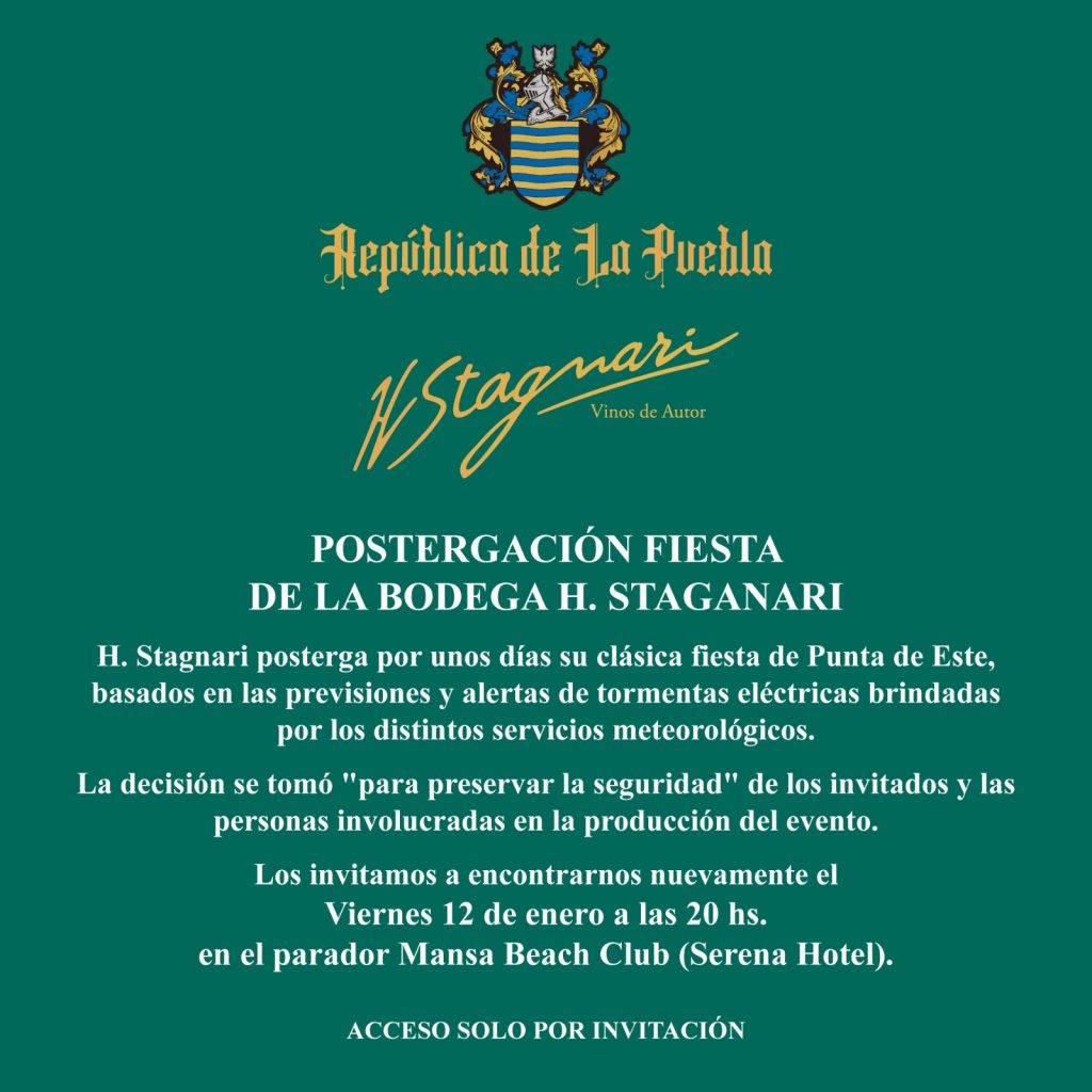 Debido a las previsiones y alertas de tormentas eléctricas se ha decidido posponer la fiesta de la bodega H. Stagnari para el día viernes 12 de enero a las 20hs.