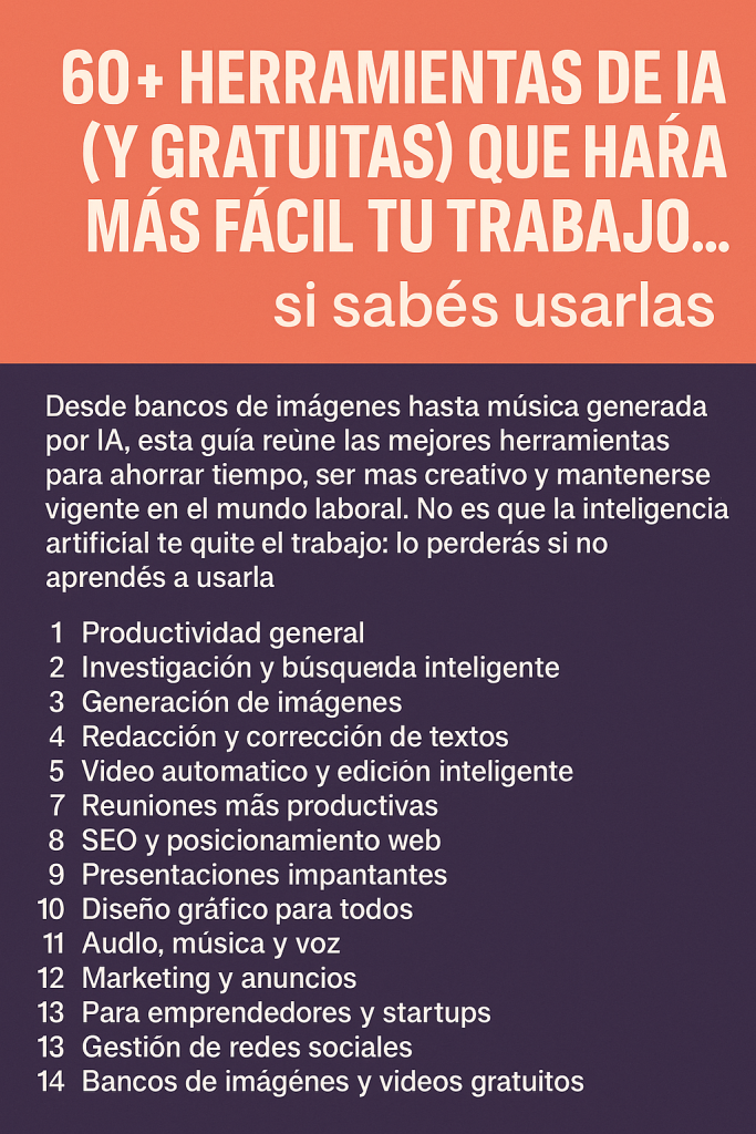 Las siguientes 60+ herramientas no reemplazan personas: reemplazan tareas repetitivas, amplifican tu creatividad y te permiten dedicarte a lo que realmente importa.