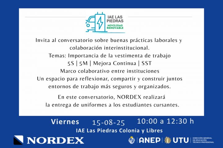 El próximo viernes 15 de agosto, el Instituto de Alta Especialización (IAE) de Las Piedras vivirá una jornada significativa que combina formación, identidad profesional y articulación con el sector productivo. En el marco de su estrategia de vinculación con el entorno, la Unidad de Extensión del IAE, bajo la dirección de la Maestra Técnica Jhael Polero, coordinará una actividad conjunta con el equipo de Responsabilidad Social Empresarial de NORDEX que dejará huella en la comunidad educativa.